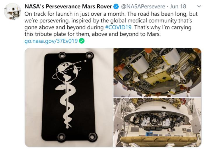 当地时间6月17日,NASA展示了一块纪念牌,它会随“毅力”号飞向火星,以此向全世界抗击新冠病毒的所有医护人员致敬。(图片来源:NASA“毅力”号火星探测器社交媒体官方账号)