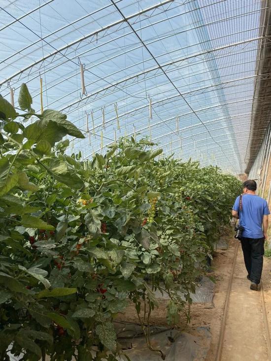 钻进大棚,里面高大宽敞、别有洞天,盛夏时节棚内通风良好,温度宜人,挂在枝上的一串串小番茄煞是诱人。这里产的小番茄可以在北京、上海的生鲜超市买到,一串十几元,是帮助当地人致富的不折不扣的“金果果”。