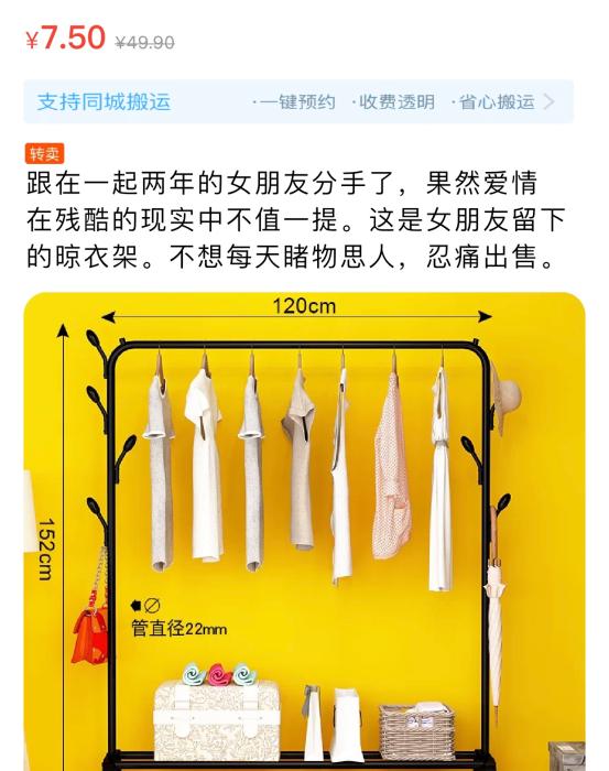 二手电商领域也差不多,有经验的卖家对商品的来源必定是要标注清楚的, “和在一起2年的女朋友分手了,女朋友留下的晾衣架,忍痛出售,不想睹物思人。”
