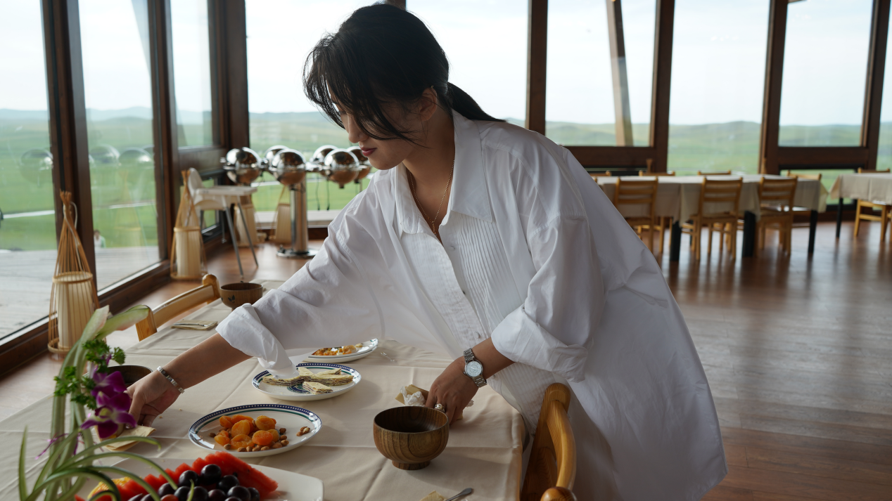 “我们现在一共有17间房,10间蒙古包,加上7间木屋,餐厅是一个360度的玻璃餐厅”,杜蓉蓉介绍,在这里,游客“仰可观日出日落,俯可瞰牛羊马群”,更重要的是,这里提供了一个让人们放松心情的场所。原始的蒙古族游牧生活、旷远的马头琴声、嘹亮悠扬的民歌,足以让人暂时将一切烦心琐事抛诸脑后。