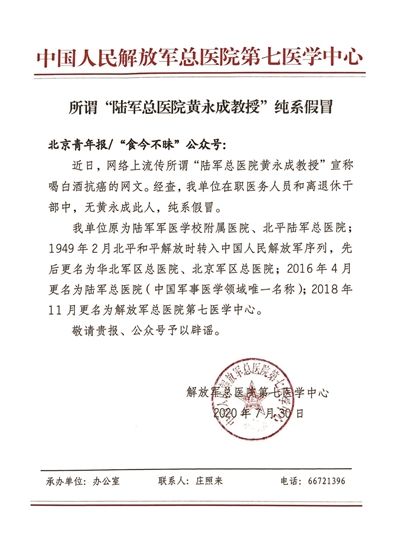 标题就表明“所谓‘陆军总医院黄永成教授’纯系假冒”,随后公函正文里也明确写道:“经查,我单位在职医务人员和离退休干部中,无黄永成此人,纯系假冒。”