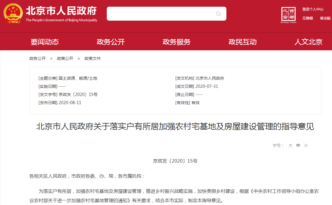 中国网8月11日讯 据北京市人民政府官网今日消息,北京市政府出台《北京市人民政府关于落实户有所居加强农村宅基地及房屋建设管理的指导意见》(以下简称:《意见》)。