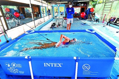 5月7日,在古巴女子铁人三项运动员莱斯利·阿玛特位于首都哈瓦那的自家屋顶,阿玛特(前)和教练迪奥塞雷斯·费尔南德斯在训练。新华社发