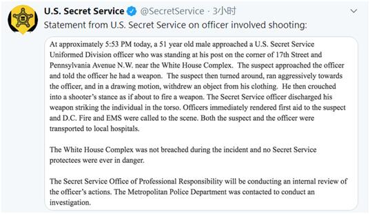 美国特勤局官方推特10日晚些时候发推,就当天傍晚特朗普召开新闻发布会之际白宫外发生的意外发表声明:“今天下午5时53分左右,一名51岁的男子走近一名在白宫建筑群附近(西北大街)17号和宾夕法尼亚大街交汇处执勤的美国特勤局制服部门人员。嫌疑人走近特勤局人员,告诉特勤局人员他有武器。随后嫌疑人转身,颇具攻击性地跑向特勤局人员,他做了一个拉伸的动作并从其衣服中掏出一个物体。然后他蹲伏成枪手姿势,好像要发动攻击。特勤局人员开枪击中了那个人的身体。特勤局人员们还立即对嫌疑人进行了急救,华盛顿特区消防队和急救队也被召集至现场。嫌疑人和(涉事)特勤局人员都被送往当地医院。”