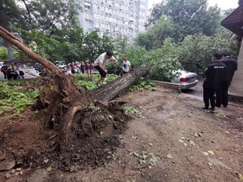 ·北京三里屯雨后一棵20余米高大树倾倒,砸中保时捷等7辆车。
