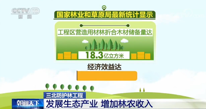 国家林业和草原局最新统计显示,截至目前,工程区营造用材林折合木材储备量达18.3亿立方米,经济效益达9130亿元。累计建成薪炭林1393.5万亩,年产薪柴799万吨,经济效益达9.59亿元。工程区累计营造经济林6945万亩,形成我国重要的核桃、红枣、苹果等干鲜果品生产基地,年产干鲜果品4800万吨,是1978年产量的30多倍,年产值达1200亿元,有1500万人依靠特色林果业实现了稳定脱贫。