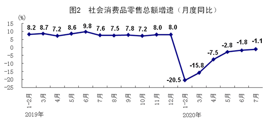 7月份,社会消费品零售总额32203亿元,同比下降1.1%,降幅比6月份收窄0.7个百分点;环比增长0.85%。1-7月份,社会消费品零售总额204459亿元,同比下降9.9%,降幅比1-6月份收窄1.5个百分点。