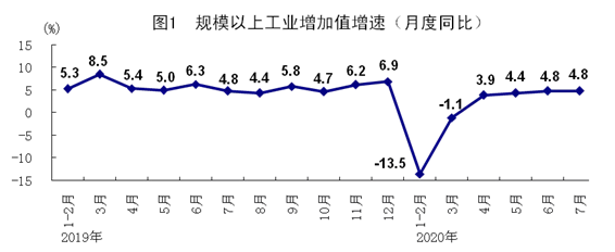 7月份,全国规模以上工业增加值同比增长4.8%,增速与6月份持平;环比增长0.98%。1-7月份,全国规模以上工业增加值同比下降0.4%,降幅比1-6月份收窄0.9个百分点。
