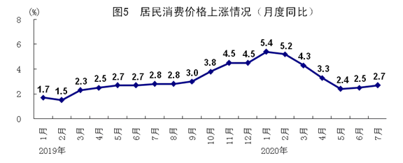 7月份,全国居民消费价格同比上涨2.7%,涨幅比6月份扩大0.2个百分点;环比上涨0.6%。1-7月份,全国居民消费价格同比上涨3.7%,涨幅比1-6月份回落0.1个百分点,总体保持平稳。