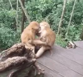 羞死人了!两只猴子接吻被发现害羞打闹。
