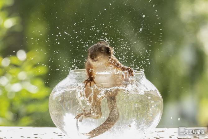 ·一只红松鼠为了躲避炎热的天气,跳入一个鱼缸中解暑。