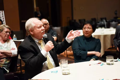 2019年5月11日,“飞虎队”老兵格伦·本尼达的儿子爱德华·本尼达(前左)在美国拉斯维加斯参加中美二战友谊暨“飞虎队”历史论坛时讲述父亲经历。新华社发