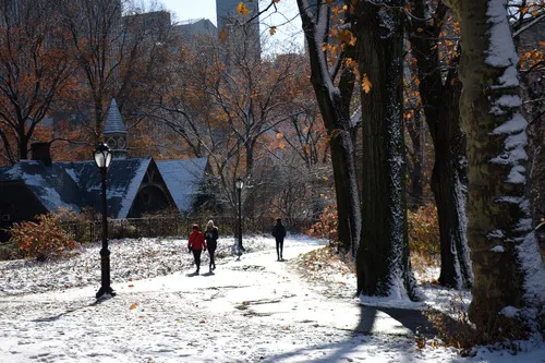 2019年12月3日,游客在美国纽约中央公园欣赏雪景。新华社发