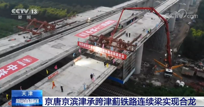 央视网消息:今天(15日)上午,京唐、京滨、津承三条高铁线路跨津蓟铁路连续梁安全合龙,这标志着京津冀三地间高铁建设的又一个施工难点实现突破。