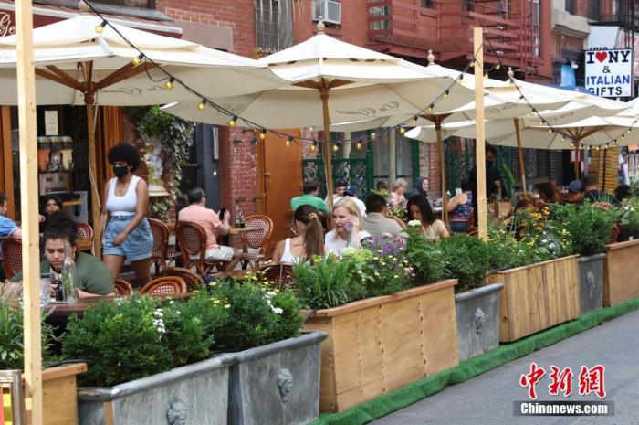 当地时间8月15日,纽约曼哈顿下城,顾客在餐厅开设的户外餐位就餐。随着纽约州经济活动逐步恢复,纽约市户外商业渐成气候。 中新社记者 廖攀 摄