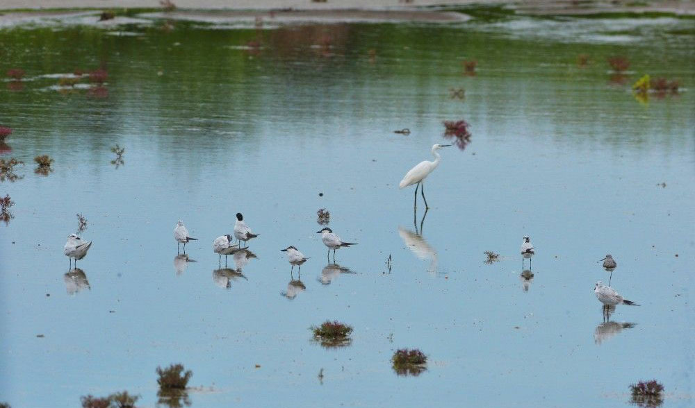 成群鸥嘴噪鸥携带幼鸟在山东省青岛市城阳区河套湿地浅水区栖息。