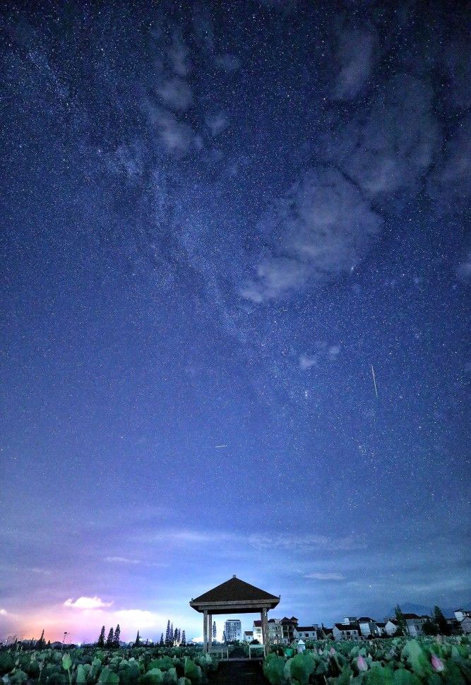 在江西省萍乡市莲花县荷花博览园,荷花与星空、银河交相辉映,构成一幅美丽的夏夜荷园图。