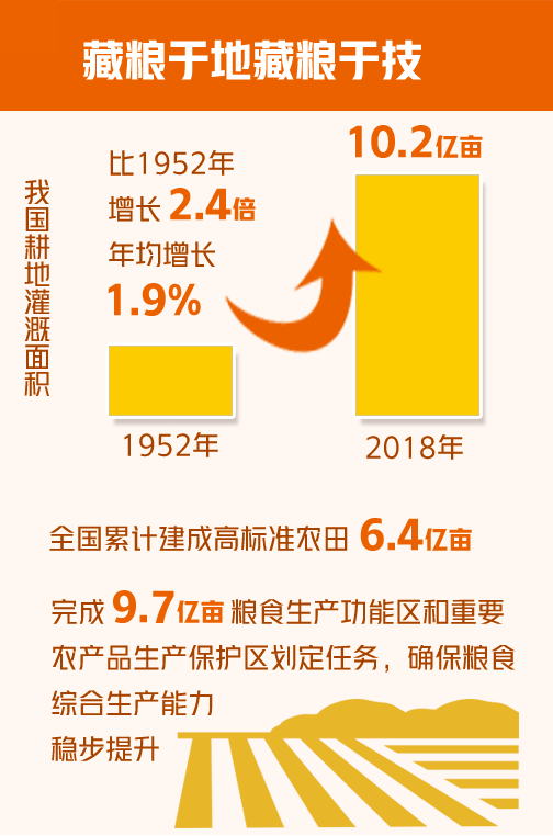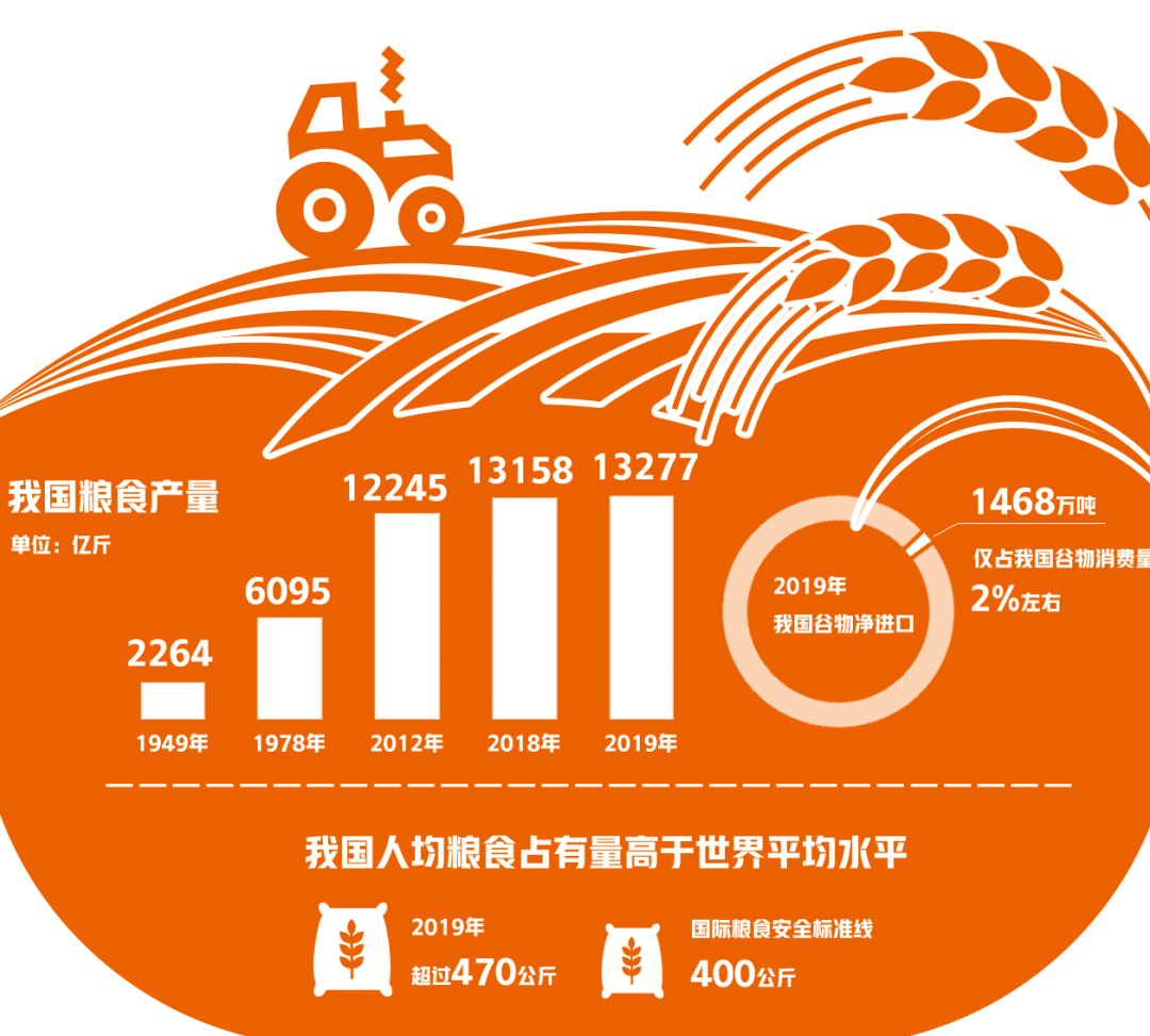 统计数据显示,1949年,我国粮食产量只有1.1318亿吨左右,人均粮食占有量只有209公斤;2019年,我国粮食产量已经连续多年突破6.5亿吨,人均粮食占有量上升至470公斤,比新中国成立时的209公斤增长了126%,高于世界平均水平。目前,我国谷物自给率超过95%,水稻和小麦两大口粮自给率超过100%,中国人已经将“饭碗”牢牢端在了自己手上。