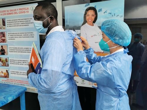 6月1日,在赤道几内亚首都马拉博,中国抗疫医疗专家组考察一所收治新冠患者的定点医院。新华社发(专家组供图)