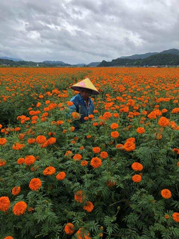 8月17日,尽管细雨绵绵,但腾冲市界头镇村民孟应国仍旧兴致勃勃冒雨采摘万寿菊。正是依靠自家种植的10亩花田,这位57岁的种植户一年可获得2万余元的收入。