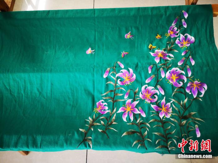 合作社里,绣娘刚完成的“萨日朗”绣品,一朵巴掌大的花需要绣3天。 郎朗 摄