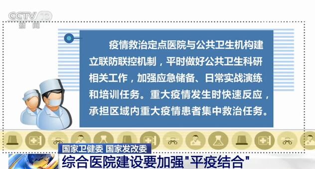 通知要求,疫情救治定点医院与公共卫生机构建立联防联控机制,平时做好公共卫生科研相关工作,加强应急储备、日常实战演练和培训任务。重大疫情发生时快速反应,承担区域内重大疫情患者集中救治任务。综合医院应当选择独立院区或现有院区内相对独立的区域、建筑,作为“平疫结合”区承担重大疫情应急救治任务。“平疫结合”区应当充分利用发热门诊、感染疾病科病房等建筑设施,合理配置与所承担任务匹配的门急诊、检验、检查、手术、重症监护、住院等医疗功能,兼顾平时使用。部分功能可采取移动设施或通过临时搭建的方式实现。