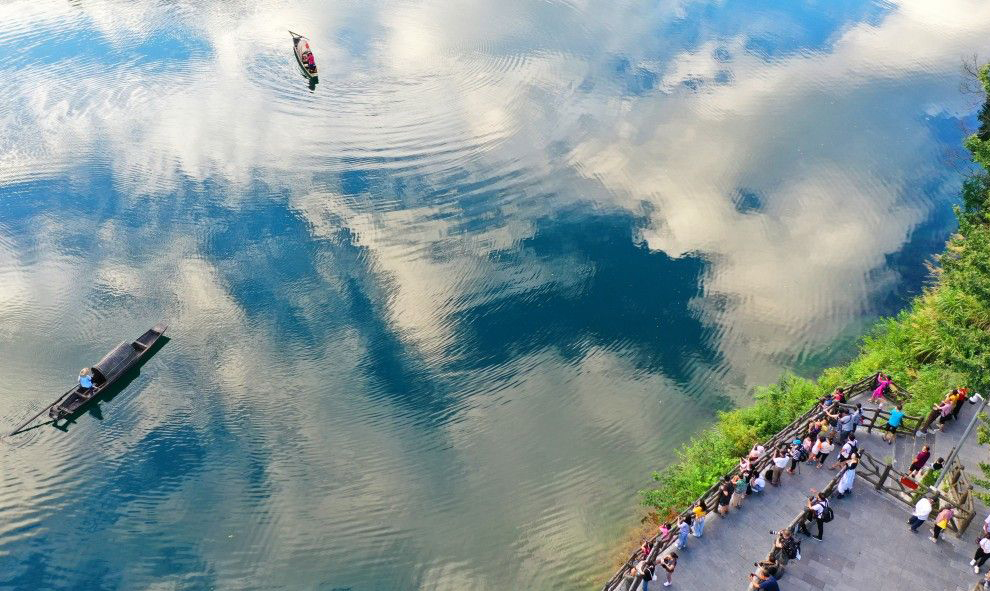 游客在湖南省郴州市资兴市小东江风景区游玩。?