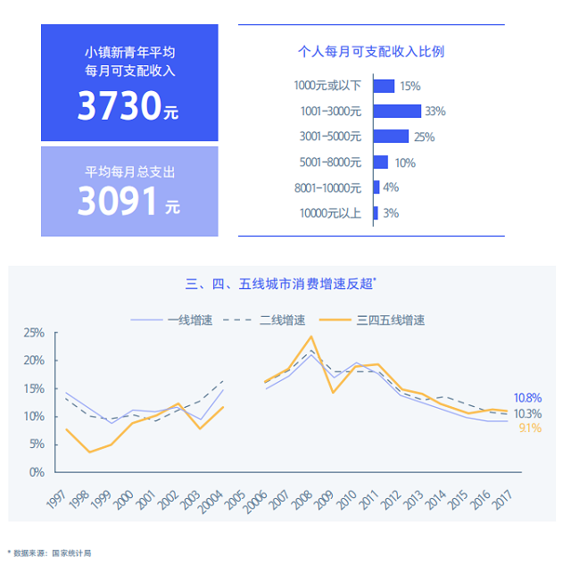 国家统计局数据显示,城镇新青年平均月收入3730元,二线城市青年5401元,两者收入水平存在差异,但城镇新青年生活成本相对较低,压力较小。 随着人均收入水平的持续上升,这些城市不断释放出更大当量的消费潜力,从2016年开始,三四五线城市的消费增长率超过了双线城市。