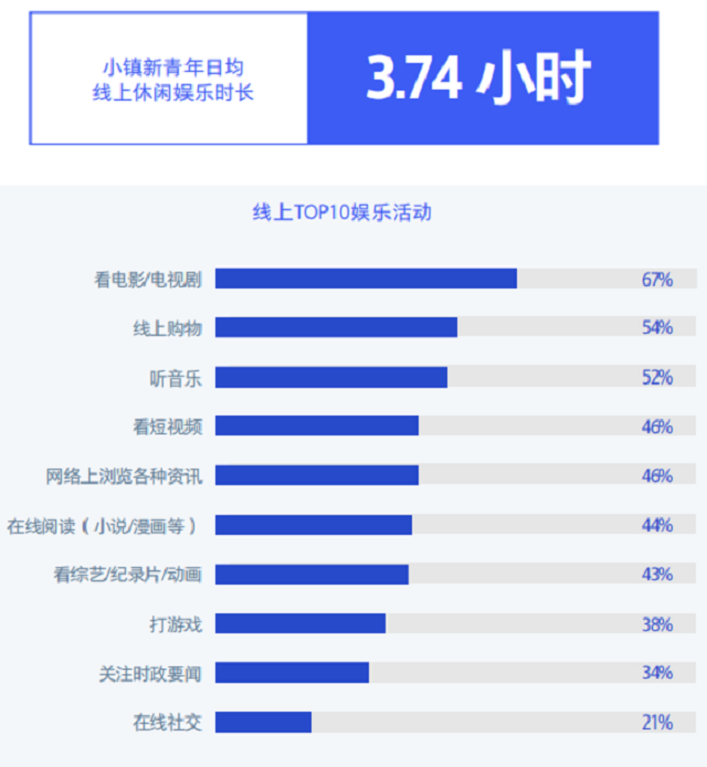 网上娱乐的不足,使城镇的新青年在线变成娱乐,寻找慰问剂,看电影/电视剧的比例最高。 城镇新青年日均线休闲娱乐时间为3.74小时,是观看电影/电视剧和网上购物,城镇新青年和二线城市青年最常进行的在线娱乐活动。 在工作和学习的馀地,他们在网上阅读信息时最关注当地的新闻班( 55% ),也喜欢看搞笑班( 51% )和八卦班( 33% )放松。 也关注国际新闻( 51% )、科学技术发展( 32% )、国际形势类( 32% )的信息内容。