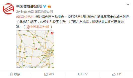 中国地震台网自动测量: 12月26日18时36分湖北孝感市应城附近(北纬30.85度,东经113.42度)发生4.7级左右的地震,最终以正式速报为基准。