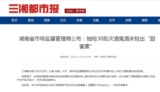 原标题:湖南省市场监督管理局宣布,即使提取30批酒鬼酒,也没有检测出甜食