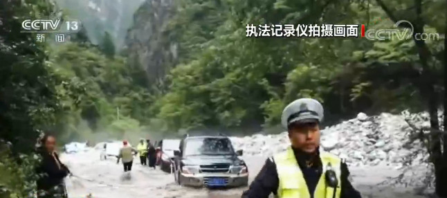 民警在天黑前赶到车辆被困处,被困车辆已经在洪水中排成长龙,很多外地游客第一次遇到山洪,惊慌失措、进退两难。为避免车辆通过涉水路段时被水流冲走,一组民警继续在车前用树枝探路,另一组民警套上绳索拉车或是帮助游客“代驾”逐一通过危险路段,剩余的民警在对面观察、接应。?????? 经过近5个小时救援,警民合力把45台被困车辆、153名人员安全带离危险路段。