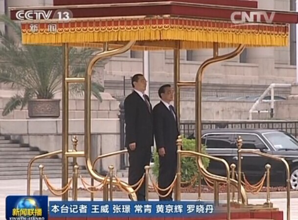 李克强陪同罗马尼亚总理对于中国人民解放军三军仪仗队进行了检阅。