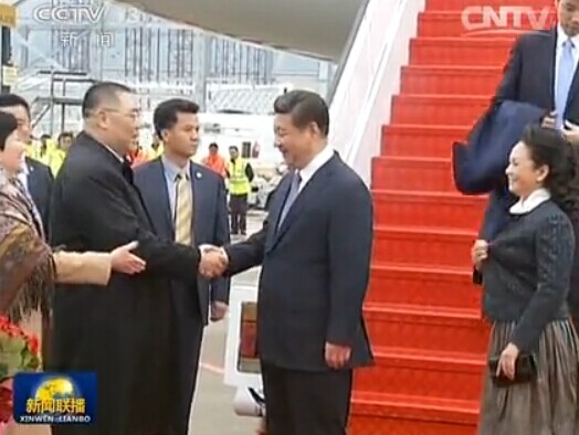 彩旗飞舞,鲜花含笑,澳门到处都是洋溢着欢乐祥和的氛围。中午12点15分,习主席乘坐的专机缓缓的降落于澳门国际机场。习主席与夫人彭丽媛走下飞机的舷梯,2名澳门的少年儿童上前分别向习主席与彭丽媛敬献鲜花。澳门的警察乐队奏响热情喜庆的欢迎曲,习主席与彭丽媛在澳门特区行政长官崔世安与夫人霍慧芬陪同之下,和前来迎接的人员亲切的握手。几百名澳门少年儿童与各界群众代表挥动手中的国旗与区旗,对于习主席的到来表示热烈的欢迎。习近平面带笑容,向欢迎的人群一次次的挥手致意。