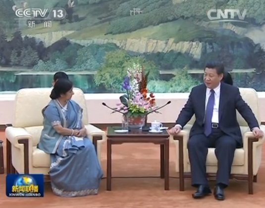 习近平请斯瓦拉吉转达对于印度慕克吉总统与莫迪总理的亲切问候与美好祝愿。习近平表示,2014年9月份我访印期间,受到印度政府与民众热情友好的接待,到现在依然记忆犹新。以这一次访问作为标志,中国和印度的关系已经迎来一个新的发展时期,中印领导人共识持续得以落实,中方和印方友好交流合作势头非常好。